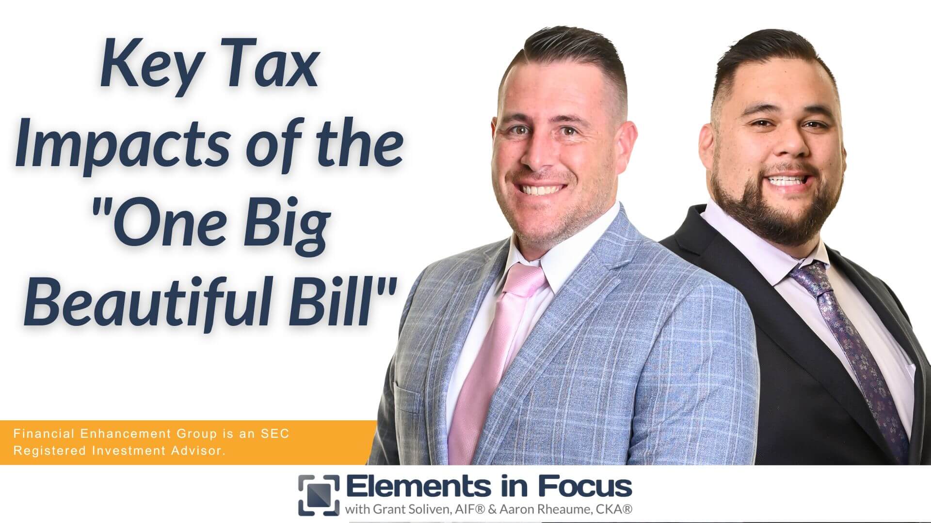 In this special edition of Elements in Focus, Aaron Rheaume, CKA®, and Sam Neff, CFP®, break down the newly passed “One Big Beautiful Bill Act” (OBBBA)—a sweeping 900-page piece of legislation with significant implications for your tax future. This week's episode centers on five key takeaways every family needs to know when navigating tax planning and financial strategy under this new law.